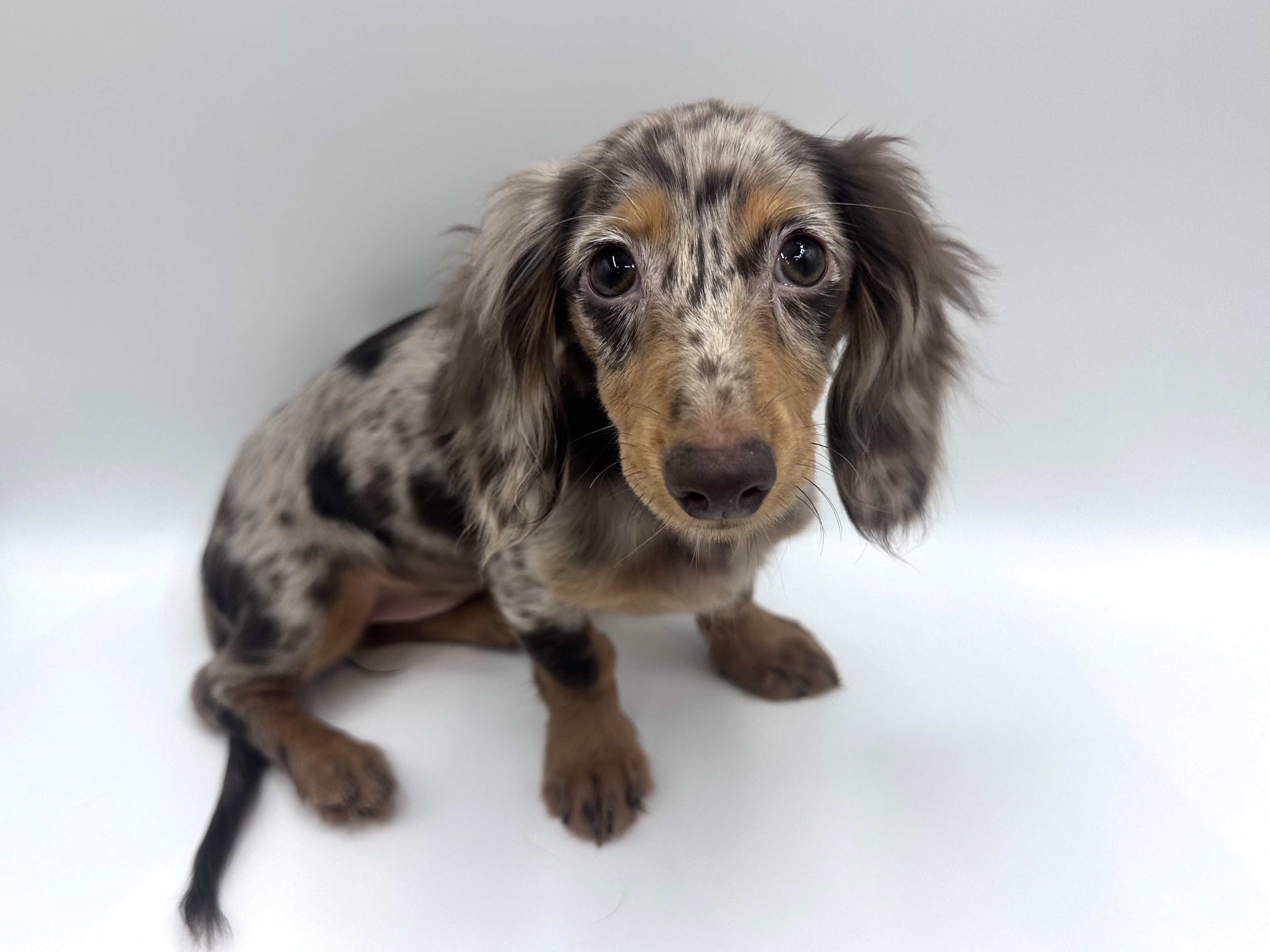 可愛いチョコダップルカラーのカニンヘンダックスフンドの女の子が六本木店に入園してくれました!ご飯大好き!愛嬌たっぷり可愛いダックスちゃんに是非会いに来てくださいね♪
